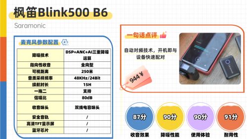 总体来说,枫笛Blink500 B6集双发无损收音、智能降噪、全设备兼容与长续航于一身,是一款真正适配新手进阶与专业轻量创作的全能型无线领夹麦。如果你既需要满足双人协作拍摄需求,又追求专业级收音品质,它无疑是该价位段性价比极高的优选之一。