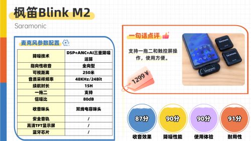 总体来说,枫笛Blink M2集双发无损收音、智能降噪、全设备兼容与长续航于一身,是一款真正适配新手进阶与专业轻量创作的全能型无线领夹麦。如果你想以中端价格享受轻量专业的收音体验,兼顾便携性与实用性,它无疑是该价位段的优选之一。