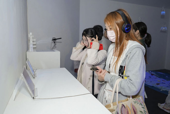 2024年,于蒙群在上海策划的《AI超感界:混合媒介与人工智能艺术融合展》展现了当下艺术家使用AI的几种基本情况,最常见的一类艺术家将作品上传到Midjourney等AICG模型中,输入指令生成图像,选取符合审美或提供灵感的图像融入创作;某些前卫艺术家直接把AI作为创作工具,借助其高效便捷性提升创作效率;还有些艺术家利用AI即时交互的特点进行艺术创作。例如艺术家徐今今的装置互动作品“鯨之歌”,艺术家收集海洋中鲸鱼的歌声,并利用AIGC进行编码。装置会根据人的声波实时生成与观众声波相呼应的鲸鱼声音。